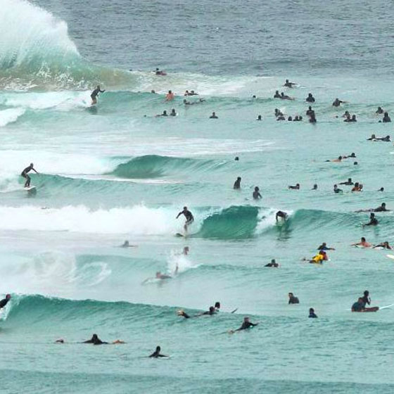 Der letzte Aspekt des wann und wo beim Wellenreiten ist der Tatsache geschuldet, dass das Wellenreiten immer populärer wird und gerade die bekannten Surfspots manchmal stark überfüllt sind. Da es aber immer nur sinnvoll und erlaubt ist, dass ein Surfer eine Welle reitet, kann eine Überfüllung eines Surfspots schnell bedeuten, dass man selber keine Welle mehr bekommt, gerade wenn mehrere deutlich bessere Surfer ebenfalls die Wellen haben wollen. Somit empfiehlt es sich abseits der ausgetrampelten Pfade selber auf die Suche nach Wellen zu gehen oder in Surfcamps vor Ort sich erfahrenen Guide anzuschliessen. Denn was bringt es wenn man zur pefekten Zeit an der perfekten Stelle im Wasser ist, sich aber 100 Surfer um eine Welle steiten?